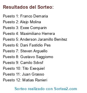 Lista de participantes: Juan Grasso, Matias Ranieri, Alejo Molina, Exee Comparin, Dani Fastidio Pes, Franco Demaria, Anderson Jaramillo Benitez, Gustavo Saggiomo, Camilo Sdvsf, Steven Arguello, Tito Exequiel, Maximiliano Herrera.