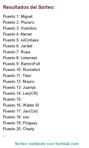 Lista de participantes: Camilo, Juampi, Polguay, Titan, RamiroFull, Schumi, Leo(CR), Miguel, Charly, Jav(Col), Alenet, Vegas, xxCintiaxx, PapiGuay, Cristina forever, Mauro, Rusa, Rockefort, Walter.SI, Vicentico, Jardiel, Lolernest, xos, Plucero, .