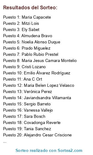 Lista de participantes: A A-Olga Rodriguez , ABelen Garcia , Adela Gonzalez Flotats , Adrian Otero , Afrika Miñon Roldan (2 participaciones), Ainodea Manualidades , Alba Garcia Marin , Alberto Neira Pérez (2 participaciones), Alberto Vidal , Alejandra Contreras , Alejandro Cesar Criscione (2 participaciones), Álex Fonseca Castela , Alfonso Herrera , Ali Tester , Almudena Bravo (2 participaciones), Amina Esbir , Ana Begoña Rubio Galindez (2 participaciones), Ana Belén Moreno , Ana Belen Vivar Loarte , Ana Bermudez Pelaez , Ana Bertol , Ana C Ort , Ana Espejo , Ana Isabel Cano , Ana Maria Vázquez Ramos (2 participaciones), Ana Martín Pérez , Ana Toro , Anais Lopez (2 participaciones), Anastasia Bc , Andrés Villalón Rodríguez , Angela Carpente Garcia , Angela Torne (2 participaciones), Ángeles Casado , Angeles Diaz Baena (2 participaciones), Angeles Fernandez Garcia , Angeles Sánchez Sicilia , Angelines Fernandez (2 participaciones), Ani Nunu , Anisa Bre , Anita Cab Vol , Antonia Corbacho , Antonia Perez , Antonia Piriz Boyero , Antonio GN (2 participaciones), Antonio Lopez Vivancos , Ari Martin , Arídiam Angeles Muñoz Gamero , Arits Martínez , Aurora Cuesta Valle , Avelina Mundo Rosaa (2 participaciones), Avon Anne , Ayna Trotamundos , Azahara Muñoz , Beatriz Esperguin , Begoña C. Ortega , Belén Martín (2 participaciones), Benigna Tasende , Blanca Fleitas , Camilucha Cabrera , Carlos Maza , Carmelam Leno , Carmen Contreras , Carmen García Moreno (2 participaciones), Carmen Luis , Carmen Madrigal Poveda , Carmen Rodríguez , Carmen Suarez Bustillo , Carolina Roger Manzano , Celia Beltrán , Chelo Moa , Chesus AR (2 participaciones), Chupeteros Atugusto Libra , Cipriano Moreno Aparicio , Clara García , Claudia Braida , Clementina Juarez , Conchi Gonzalez , Covadonga Reverte , Cristi Lozano , Cristina Atienza , Cristina Obregon , Cristinaa Soria Vilella , Cristobal Rabadan , David Castro Barrera , David Hyde (2 participaciones), Dea Volaric , Debora Hernandez Delgado , Déborah Tg , Diana P-a (2 participaciones), Dolores Rivas , Dolores Soler Rodriguez (2 participaciones), Dominguez Ta , Duni De Prado , E Jose Alvarez , Edu P. Soca , ElBaul de Di (2 participaciones), Elena Alvarez Bustelo , Elena Salvador , Elena Sánchez (2 participaciones), Elena Torres , Elisa Isabel Manzanares Artes , Elisa Martinez , Elisabeth Jiménez , Ely Sabet , Emely Gamboa (3 participaciones), Emilio Álvarez Rodríguez , Encarnacion Gullon Arias , Encarni F. Estevez , Encarni Garcia , Èrica Vargas , Erick Lopez , Estela Cris , Estrella Sierra , Eva Fortuño , Eva Ortiz Colon , Eva PB , Eva Trujillo (2 participaciones), Eve B Ol , Ezequiel Gonzalez Molina , Fanie Di Natale (2 participaciones), Fátima Barreira López , Feli Gea Pérez , Fernando Roldán Rodríguez , Fina Quintanar Meco , Flor BG , Floren Toni Stösslein Soriano , Fran Lago , Francina Bou Claramunt , Francis Velasco (3 participaciones), Francisco Javier Garcia Hernandez , Fuensanta Carrillo , Gema Peque , Gemma Ezquerra Ruzafa , Georgina Jubert Tort , Gladis Acevedo , Gloria A. Garcia , Gloria Miguelez , Gloria Urquidi , Gorety Alonso , Graça Victória Maranhoto , Idaira Hernandez , Inma Martinez Perez , Inma Perez Pastor , Inmaculada Linares Cruz , Irene Cid , Iris Manfre (2 participaciones), Isa Rafa (2 participaciones), Isabel Gragera , Isabel Miranda , Isi Ggra , Javiandsandra Villamanta (2 participaciones), Jean Laborda Lazarte , Jenn Evidentemente , Jessi Trupia , Jessica Baños Gomez , Jesus Castro Barrera , Jesús Márquez , Jesús Pérez Cámara , Joana Sánchez , Joaquin Roldan , Jone Jambrina , Jordina Ibablanco , Jose A. Bayon , Jose Antonio Hermida Castro , Jose Antonio Martín (2 participaciones), Jose Carlos Rabadan , Jose Javier Nieto , Jose Luis Gonzalez , Jose Manuel Lermos Mendez , Jose Marcos Armesto , Jose Maria Robles Llorente , Jose Ramon Gonzalez Ventura , Jose Zamorano Fernandez , Josefa Hernandez Santana , Josy Sola Olivencia , Juan Carlos Rubio Prestel , Juan Guillen , Juan Jose Hurtado , Juan López , Juan Rubio , Juani Beltran Calvo , Judiit Lechuga Grado , Kamal Sev (2 participaciones), Kapitana Corsaria Pirates , Kika Kika , Kini Rodriguez , La Pitiki , Lara Lois , Laura Dominguez , Lauri Rodriguez Lopez , Lazarte Laly (2 participaciones), Leon Paredes Nestor , Lissete Murillo Zavala , Loli Crespo , Lor Enix (3 participaciones), Lore Ismamiriam , Loren Cano Soler (2 participaciones), Lorena Alonso Gonzalez (3 participaciones), Lorena Felina , Lorena Garcia , Lorena Gomez Miguelez , Lorena Jurado , Lourdes Dinares , Lourdes Hernández , Lu Bel , Luisa Moreno de Matias , Luisma S. Orosa , M Angels del Val , M Soledad Iguinis , Maite Lopez Vivancos , Maite Torres , Manuel Zubeldia Huidobro , Mar Balsells Olivella , Mar Lopez Velasco , Mar Saelices , Marcela Alejandra , Margarita Isern Gual , Mari Carmen Fernandez Lopez , Mari Carmen Peña , Mari Lorenzo , María Guadalupe Martín (2 participaciones), Maria Arcas GP Maria , Maria Baena Serrato (2 participaciones), Maria Belen Lopez Velasco (2 participaciones), Maria Capacete (2 participaciones), Maria Carmen Hernandez Mendez , Maria Coronada Rosa , Maria Del Mar Casado Ureña , Maria DelCarmen Rodríguez Gracia , Maria Elena Sinmas , María G. Corzo Suárez , Maria Gamarra Marcos , Maria Iluminada Martinez Garcia , Maria Isabel Artes Sanchez , Maria Isabel Ferrer Lopez (2 participaciones), Maria Jesus Camara Montelio , Maria Jose A , Maria Jose Armand , Maria Jose Lopez Velasco , María José Manzanares Artés , Maria Jose Rosello , Maria M Valverde , María M. Tinoco , Maria Martin Perez , Maria Martinez Zorzano , María Mercedes Cañavate Siles , Maria Quiroga , María T. Romero , Maria Teresa Fernandez Ferreira , Maria Valiente (3 participaciones), Maria Valverde , Maria Wasmer Romero , Mariaje Outeiral , Marial Cristobal (3 participaciones), Mariangeles Sales Perales , Maribel Pinto Fuillerat , Maribel Vela Pijuan , Mariete Cab Vol , Marimar Mar