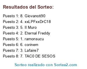 Lista de participantes: 1. ramonsucu, 2. Eternal Freddy, 3. Lafaire7, 4. xxLPFxxDrC18, 5. Il Muro, 6. corinem, 7. TAC0 DE SESOS, 8. Giovanoti90.
