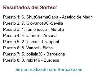 Lista de participantes: 1. ramonsucu - Morelia, 2. xinpun - Liverpool, 3. rubi146 - Burdeos, 4. lafaire7 - Arsenal, 5. bollain36 - Barcelona, 6. ShutChemaGapa - Atletico de Madrid, 7. Giovanoti90 -Sevilla, 8. Vanoel - Elche.