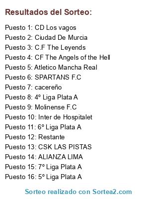 Lista de participantes: 4º Liga Plata A, 5º Liga Plata A, 6º Liga Plata A, 7º Liga Plata A, ALIANZA LIMA, Atletico Mancha Real, C.F The Leyends, cacereño, CD Los vagos, CF The Angels of the Hell, Ciudad De Murcia, CSK LAS PISTAS, Inter de Hospitalet, Molinense F.C, Restante, SPARTANS F.C.