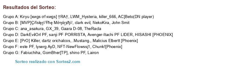 Lista de participantes: Participante 1: este PF, Participante 2: sanji PF PORRISTA, Participante 3: lyserg AyD, Participante 4: [PrO] Killer, Participante 5: TheRacla, Participante 6: AC]Beto(DN player), Participante 7: John Smit, Participante 8: ana_asakura, Participante 9: HISASHI [PHOENIX], Participante 10: LWM_Hysteria, Participante 11: shino PF, Participante 12: Avenger-Itachi PF LIDER, Participante 13: dartz orichalcos, Participante 14: NFT-NewFlowssj1, Participante 15: Malicius Elbertt [Phoenix], Participante 16: [MVP]Çŕĭslęŗ//Ŧħę Mớŋάŗ¢ђ//, Participante 17: Chunk![Phoenix], Participante 18: GomBher[TP], Participante 19: Gaara D-08, Participante 20: Lairon, Participante 21: Fabiuchiha, Participante 22: DarkEvilOrl PF, Participante 23: Kiryu [кιиgѕ σf кιиgѕ] †RA†, Participante 24: GX_39, Participante 25: killer_666, Participante 26: clark evil, Participante 27: NekoKira, Participante 28: .Mustang..