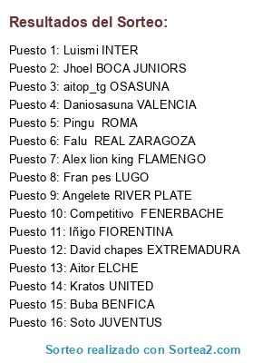 Lista de participantes: Aitor ELCHE, Alex lion king FLAMENGO, aitop_tg OSASUNA, Fran pes LUGO, Competitivo FENERBACHE, Kratos UNITED, David chapes EXTREMADURA, Angelete RIVER PLATE, Jhoel BOCA JUNIORS, Falu REAL ZARAGOZA, Iñigo FIORENTINA, Soto JUVENTUS, Daniosasuna VALENCIA, Buba BENFICA, Luismi INTER, Pingu ROMA.