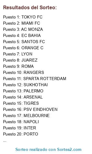Lista de participantes: SANTOS FC, RIVER P, PSV EINDHOVEN, BARCELONA, AC MONZA, BENFICA, ROMA, TOKYO FC, SUKHOTHAI, INTER, TIGRES, MARSELLA, EC BAHIA, PUMAS, MANCHESTER UTD, BESIKTAS, PORTO, RED BULL, LAZIO, MELBOURNE, PARMA, ARSENAL, CLUB TIJUANA, MIAMI FC, LYON, AC MILAN, JUAREZ, SANTOS LAGUNA, BOCA JR, LILLE, PALERMO, ORANGE C, AJAX, NAPOLI, SPARTA ROTTERDAM, RANGERS, AMERICA.