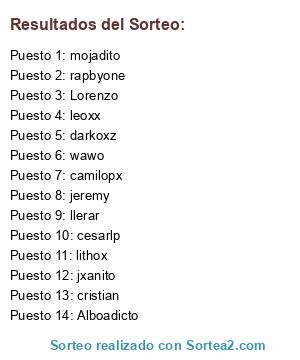Lista de participantes: rapbyone, llerar, mojadito, jeremy, wawo, leoxx, cesarlp, darkoxz, cristian, jxanito, Alboadicto, Lorenzo, lithox, camilopx.
