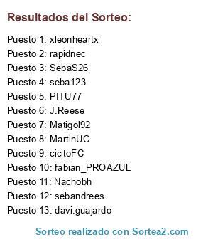 Lista de participantes: Matigol92, davi.guajardo, PITU77, J.Reese, rapidnec, xleonheartx, SebaS26, cicitoFC, fabian_PROAZUL, seba123, sebandrees, Nachobh, MartinUC.