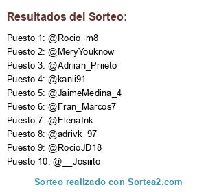 Lista de participantes: @Henry_Gio, @milkandhoneyp, @alex_plaza_99, @Rocio_m8, @ArantxaaRHiges, @andresvazquez97, @BandaHurto, @SandraHaro, @RocioJD18, @MeryYouknow, @IZALmusica, @BarbaraCompte, @josanruni, @Lafuerzaverde, @titus_emilio, @kanii91, @rmc_9, @AlbaAyu, @jose8camacho, @alvaritosoler, @robertitotiri, @__Josiiito, @ElenaInk, @jBosco_21, @RociXIV, @adrivk_97, @AfOscar, @jaime_alcalde, @csaez_, @tobi_tweet, @Adriian_Priieto, @DavidRayo_8, @DAVIDDavefcb, @JaimeMedina_4, @navarroyela, @Fran_Marcos7, @CristinaMM27, @AnaPina93.