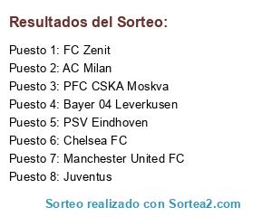 Lista de participantes: Bayer 04 Leverkusen, Juventus, PFC CSKA Moskva, PSV Eindhoven, Chelsea FC, Manchester United FC, FC Zenit, AC Milan.