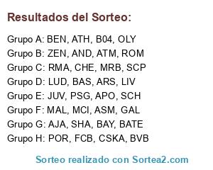 Lista de participantes: RMA, FCB, ATM, ATH, MCI, LIV, ARS, CHE, BVB, BAY, B04, SCH, PSG, ASM, JUV, ROM, AND, APO, OLY, POR, BEN, SCP, SHA, ZEN, CSKA, MAL, BAS, MRB, AJA, GAL, BATE, LUD.