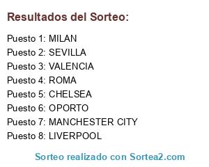Lista de participantes: SEVILLA, CHELSEA, VALENCIA, OPORTO, MILAN, ROMA, MANCHESTER CITY, LIVERPOOL.