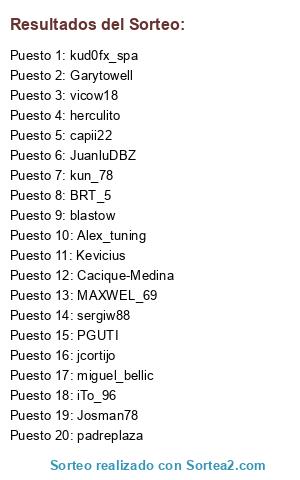 Lista de participantes: iTo_96, kud0fx_spa, padreplaza, Alex_tuning, PGUTI, BRT_5, sergiw88, Cacique-Medina, JuanluDBZ, MAXWEL_69, herculito, Kevicius, miguel_bellic, capii22, blastow, jcortijo, vicow18, Garytowell, kun_78, Josman78.