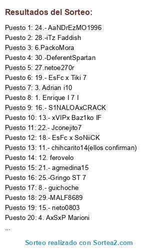 Lista de participantes: 1. Enrique I 7 I, 2. Ironrulo, 3. Adrian i10, 4. AxSxP Marioni, 5.AH1N1 MaKsIm M, 6.PackoMora, 7.- oFSo xIShaDoIx, 8.- guichoche, 9-. Hullshulk, 10.- blackgreimo, 11.- chihcarito14(ellos confirman), 12. ferovelo, 13.- xVIPx Baz1ko IF, 14.-BlisteryDOM, 15.- neto0803, 16.- S1NALOAxCRACK, 17.- Oti9, 18.- EsFc x SoNiiCK, 19.- EsFc x Tiki 7, 20.- EsFc x Neymar11, 21.- agmedina15, 22.- Jconejito7, 23.- Alvis M4L, 24.- AaNDrEzMO1996, 25.-Gringo ST 7, 26.-Sagato009X, 27.netoe270r, 28.-iTz Faddish, 29.-MALF8689, 30.-DeferentSpartan.