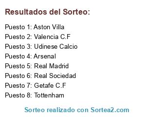 Lista de participantes: Valencia C.F, Real Madrid, Real Sociedad, Udinese Calcio, Arsenal, Aston Villa, Tottenham, Getafe C.F.