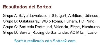 Lista de participantes: Hamburgo, Bayer Leverkusen, Udinese, A.Bilbao, Valencia, Galatasaray, Racing de Santander, Sttutgart, Fulham, Elche, Sevilla, FC Porto, Borussia Dortmund, Lazio, AC Milan, WB o Roma.