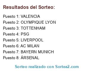 Lista de participantes: LIVERPOOL, OLYMPIQUE LYON, ÁRSENAL, PSG, BAYERN MUNICH, TOTTENHAM, VALENCIA, AC MILAN.