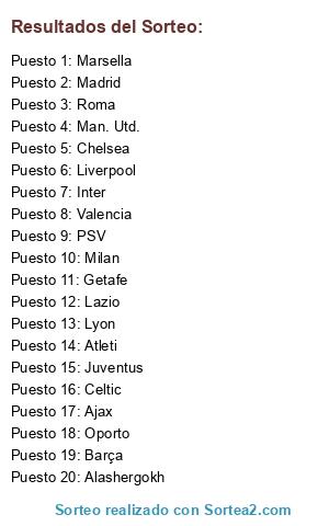 Lista de participantes: Chelsea, Liverpool, Man. Utd., Barça, Madrid, Valencia, Atleti, Getafe, Alashergokh, Roma, Juventus, Lazio, Milan, Inter, Oporto, PSV, Ajax, Lyon, Marsella, Celtic.