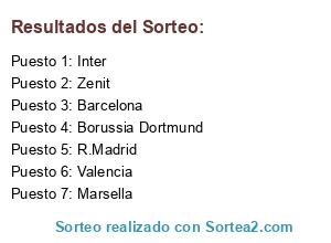 Lista de participantes: Inter, R.Madrid, Borussia Dortmund, Barcelona, Valencia, Zenit, Marsella.