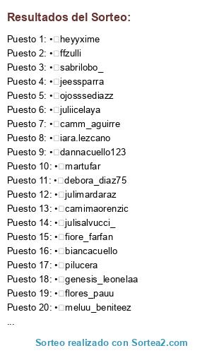 Lista de participantes: • duk_fashion, • micaelasoldiaz_, • ailucoronel, • maarubejarano(2 participaciones), • aixadepetris, • ayee_olivieri, • daianascuteri, • mechimoss, • camimuga, • martufar(2 participaciones), • biangargiulo, • prii.bongiorno, • _luceleste, • sabi.alfonso(2 participaciones), • micaela_uyarte, • candeberraz, • micacastillo16, • dannacuello123, • rochipinal, • ornecastellano, • juliietasosabreenamaral, • kathy__cambronero, • niqidepetris, • micumicaa, • celesterojas12, • brengonzalez03, • _agusparra, • nairjuarez14, • ximealmaraz, • gabicardon, • belchumartinez, • cami.perezlujan, • manuucifuentes, • carobelleggia, • danielacardon_, • martinalevczuk_, • carocarnero_, • biancacuello(2 participaciones), • chiarifarfan_(2 participaciones), • __andrerivera, • pameejofre, • micaelalertora(2 participaciones), • camm_aguirre(3 participaciones), • agosmarello_, • yesisanchez1, • brisaspring_, • sabri.reyes, • camii_kc, • rosario_palacios, • maggiecifuentes, • naazaroldan, •, • lorverdun(2 participaciones), • elibracamonte, • micanaka, • carobossie(4 participaciones), • ro.castro1, • pri_martinez23carobossie, • valentinadrosa(4 participaciones), • ari_senger, • jeessparra(2 participaciones), • miica_ag, • belencapien, • miculedesma, • sofi.munoz3, • pilucera, • sofimendez98(2 participaciones), • rominarocioo, • almijuarez06, • debora_diaz75, • aylufascella(2 participaciones), • sofimattaldidiazfloruevee.rivera, • lulippaz(2 participaciones), • solalegre93, • beelsorrentino, • vitabejarano, • bren_bog, • cinthia.gomezz, • jazminnmartinez_, • oriipereyraa, • ppaurruttia, • ariorue, • luubenitez97, • ojosssediazz, • camilakittler, • valenbrioness, • agusreinosa, • sofibuffa(3 participaciones), • miaalogildee, • milubalestrieri, • ayniirolon, • lolaloriente(3 participaciones), • ololaloriente, • julisalvucci_(4 participaciones), • danamenaa(3 participaciones), • lalidiaaz(3 participaciones), • mmartu.camu, • luurezzano, • cotyburjel(2 participaciones), • deni_sempe, • valugaray, • nayrufranzo, • valenromann, • angiealegree, • flores_pauu, • camzabala, • floramado_, • camilabrandan_, • mel_willer13(7 participaciones), • manupiniero_(2 participaciones), • heyyxime, • juliicelaya, • mili.coronell, • camiglenn, • rooinlove, • caarmasucci, • julirotondo, • camifloresch, • jochu_jaurena, • iluayala, • genesis_leonelaa, • _micaelapalacios, • xmaaite.16, • valualfonso, • danna_brandan, • piilisandoval, • agoosbartoli(2 participaciones), • mar_ardissone(2 participaciones), • maagali.s., • floorgini, • fridaindu, • melumontenegro, • b.iancx, • melchcaballero, • anicontrera, • ccandediaz(3 participaciones), • belubossie(2 participaciones), • celesgutierrez, • nahialmiron, • meluu_beniteez, • beryhernandez, • rociobxlen, • bren.magaly, • maguiacostaa, • ludmilacisneros, • soolpenna, • maicalvari(4 participaciones), • guadi.lu(3 participaciones), • pachumeli, • romirueda(2 participaciones), • maggie_presman, • lucilapaez(2 participaciones), • ffzulli, • sofivane1(2 participaciones), • breem.seip, • meluvigo, • iara.lezcano, • felimolinari, • bel_pranzo(6 participaciones), • belen_ochoa15, • sabrilobo_, • fiore_farfan, • violeopmaniis_, • meraki.pasteleria, • renubotello(3 participaciones), • gabriielaayala, • lourabril_(2 participaciones), • lopez6296, • ludmilaylenn😍, • ornee_carp(3 participaciones), • camila_carbone, • thaali_gonzalez♡, • sofimattaldi, • daniielafalcon, • _paulasosa, • nazafigueroa, • josefinaleiva1, • cosmeticoslacalidherma, • candellavega, • camimaorenzic, • maimonsalvo, • mel.gerez, • danibritoss, • eve.gonzalezz, • fatigossn(2 participaciones), • marianadiazz1, • celestesantalices, • celesricci(4 participaciones), • rociogerardii, • solsantiago_, • julimardaraz(2 participaciones).