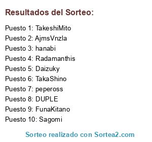 Lista de participantes: Sagomi(2), TakaShino(2), Daizuky(2), pepeross(2), KairiMizukami(2), hanabi(2), DUPLE(2), FunaKitano(2), AjmsVnzla(2), Radamanthis(1), PainKiller(1), BigJorge(1), TakeshiMito(4).