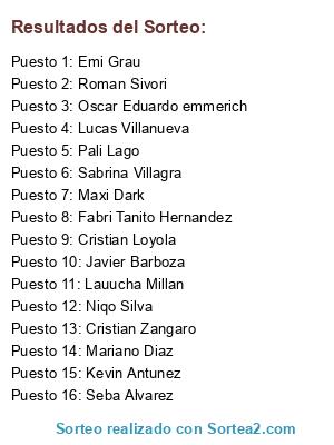 Lista de participantes: Cristian Loyola, Oscar Eduardo emmerich, Maxi Dark, Mariano Diaz, Seba Alvarez, Javier Barboza, Pali Lago, Emi Grau, Lucas Villanueva, Niqo Silva, Cristian Zangaro, Sabrina Villagra, Roman Sivori, Lauucha Millan, Fabri Tanito Hernandez, Kevin Antunez.