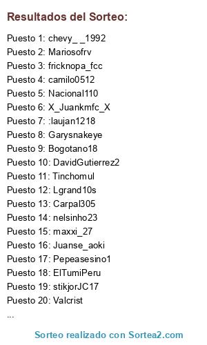 Lista de participantes: Garysnakeye, cristhian_fistks, Leodiaz_27, JavierOp915, CamiloDiaz6, Fer-Villa105, fricknopa_fcc, onlysantew, Juanse_aoki, Cfc_Zlatan, Ramagol5, ElTumiPeru, JMpIx, WillMolinag, peselepo, Carpal305, Andresmesa11, Polaniar, Tinchomul, PERUANOFORCE10, LeanDami05, JAZON10FCB, JR-Palazzo, Ricawoody14, nelsinho23, Naluffy-D, Tu-muert3, Lokombia_27, Nacional110, Fenomenal1993, diegoalvarez12, Jovanny1981, FF-GERMAN, Lgrand10s, HND _ - Marcos - _ HND, Lcharry79, Bogotano18, chevy_ _1992, flosanlopez17, SergioAlbi-Rojo, Nathan_0223, DavidGutierrez2, Yalexito7, stikjorJC17, camilo0512, jotalnator, matiasmarin2014, Cajf, JulianMB1986, Unseaminghawk, YSIKSTBN24, snake-0751, X_Juankmfc_X, Colombiannicko, :laujan1218, Juanksh1133, Axuby, torettoidag, Mateo_CFI, XxfAlcoxX_, ironmaneslaond, Pablo_CJA, joZeto_90, Mariosofrv, snake-075, Siiriiuus, The_keane29, o11ceCaldas, maxxi_27, Hetchiring, Botyz10, LM_Mafla_I9I, DECANO_TORRES, melendez_marco, adonko, Pepeasesino1, davidal1014, Torettao-CFI, Valcrist.