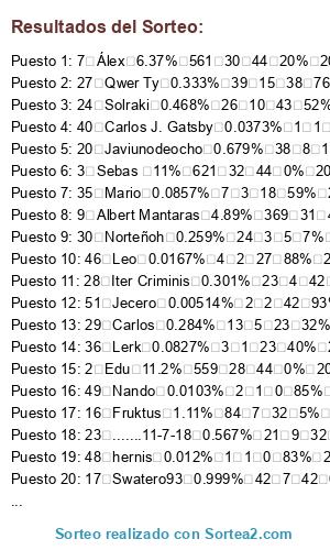 Lista de participantes: 1 Leinad 12.9% 789 30 43 0% 2020-03-11 14:02:03 2020-04-24 00:58:35, 2 Edu 11.2% 559 28 44 0% 2020-03-11 14:01:29 2020-04-24 09:33:05, 3 Sebas 11% 621 32 44 0% 2020-03-11 10:56:58 2020-04-24 10:17:38, 4 C4nt3r 7.99% 301 11 10 0% 2020-04-13 19:19:24 2020-04-23 20:51:53, 5 Aitower 7.05% 548 30 44 14% 2020-03-11 11:12:14 2020-04-24 05:26:05, 6 Marc Jornet 6.62% 528 30 43 27% 2020-03-11 12:38:53 2020-04-23 18:22:44, 7 Álex 6.37% 561 30 44 20% 2020-03-11 12:34:10 2020-04-24 05:24:45, 8 Ander 5.9% 373 28 44 2% 2020-03-11 11:00:10 2020-04-24 10:14:55, 9 Albert Mantaras 4.89% 369 31 44 31% 2020-03-11 11:10:27 2020-04-24 08:41:37, 10 Dani Martin 4.53% 302 18 24 7% 2020-03-29 18:25:10 2020-04-22 13:38:32, 11 Alex 3.42% 111 21 38 0% 2020-03-11 11:36:38 2020-04-18 17:24:09, 12 Alex 3.17% 286 23 43 14% 2020-03-11 11:57:33 2020-04-23 22:39:24, 1. L. G. Z. 0. 0., 14 Fon 1.63% 49 10 43 0% 2020-03-11 11:46:19 2020-04-23 23:41:53, 15 Marc 172 1.25% 69 19 44 40% 2020-03-11 20:48:08 2020-04-24 03:02:53, 16 Fruktus 1.11% 84 7 32 5% 2020-03-22 11:32:46 2020-04-23 22:15:16, 17 Swatero93 0.999% 42 7 42 0% 2020-03-12 08:46:13 2020-04-23 14:26:23, 18 est3ban129 - cloudbit.es 0.779% 61 5 9 0% 2020-04-13 21:24:14 2020-04-22 17:20:42, 19 ••• ••• 0.727% 57 5 34 19% 2020-03-11 19:26:55 2020-04-14 22:51:44, 20 Javiunodeocho 0.679% 38 8 15 0% 2020-04-08 23:07:41 2020-04-23 14:35:06, 21 Eypo 0.646% 26 10 40 15% 2020-03-12 10:29:58 2020-04-21 11:59:05, 22 Kordo_B 0.618% 35 10 41 31% 2020-03-11 20:03:04 2020-04-21 14:33:40, 23 .......11-7-18 0.567% 21 9 32 9% 2020-03-16 21:25:29 2020-04-17 14:51:39, 24 Solraki 0.468% 26 10 43 52% 2020-03-11 14:58:32 2020-04-23 19:09:11, 25 David 0.457% 31 10 28 53% 2020-03-11 21:27:55 2020-04-08 11:16:05, 26 Fran Villa 0.347% 28 3 4 17% 2020-04-19 14:05:29 2020-04-23 22:25:23, 27 Qwer Ty 0.333% 39 15 38 76% 2020-03-11 16:44:43 2020-04-18 23:44:10, 28 Iter Criminis 0.301% 23 4 42 38% 2020-03-12 19:30:00 2020-04-23 09:55:15, 29 Carlos 0.284% 13 5 23 32% 2020-03-31 17:47:39 2020-04-24 00:31:55, 30 Norteñoh 0.259% 24 3 5 7% 2020-04-18 23:00:20 2020-04-23 14:15:44, 31 Javi 0.15% 14 5 33 46% 2020-03-12 08:23:15 2020-04-14 23:19:30, 32 Wilfred Jonhson 0.131% 1 1 8 0% 2020-04-14 22:44:17 2020-04-22 16:56:21, 33 Celso 0.116% 16 5 24 58% 2020-03-24 21:05:45 2020-04-17 05:58:35, 34 Piti 0.107% 2 1 0 0% 2020-04-06 23:36:46 2020-04-06 23:42:57, 35 Mario 0.0857% 7 3 18 59% 2020-03-28 21:53:50 2020-04-16 00:45:09, 36 Lerk 0.0827% 3 1 23 40% 2020-03-11 11:08:52 2020-04-03 13:57:28, 37 Swag Size 0.0677% 9 1 0 67% 2020-04-19 17:20:59 2020-04-19 19:07:57, 38 Angel 0.0433% 4 2 5 79% 2020-04-19 00:41:55 2020-04-23 10:00:38, 39 Esca! 0.042% 3 1 29 39% 2020-03-11 17:13:13 2020-04-09 16:53:08, 40 Carlos J. Gatsby 0.0373% 1 1 0 46% 2020-04-21 23:23:03 2020-04-21 23:24:40, 41 Carras 0.0364% 4 3 29 82% 2020-03-21 15:48:39 2020-04-19 16:34:57, 42 C 0.0339% 3 1 0 76% 2020-03-24 16:42:05 2020-03-24 18:41:24, 43 Adrián 0.0317% 2 1 13 54% 2020-03-15 11:27:44 2020-03-28 15:49:31, 44 Alfo 0.03% 3 1 33 57% 2020-03-12 12:37:43 2020-04-15 01:18:55, 45 Daniel Lijarcio Mora 0.0184% 1 1 0 73% 2020-04-07 12:04:17 2020-04-07 12:04:17, 46 Leo 0.0167% 4 2 27 88% 2020-03-21 02:22:49 2020-04-17 19:14:43, 47 Juan Mendez 0.0141% 2 1 0 80% 2020-04-23 22:20:32 2020-04-23 22:22:19, 48 hernis 0.012% 1 1 0 83% 2020-04-13 08:50:19 2020-04-13 08:50:19, 49 Nando 0.0103% 2 1 0 85% 2020-04-23 20:21:18 2020-04-23 20:21:12, 50 Christian 0.00557% 1 1 0 92% 2020-04-23 18:05:04 2020-04-23 18:24:23, 51 Jecero 0.00514% 2 2 42 93% 2020-03-12 11:11:09 2020-04-23 21:35:45, 52 Turu 0.00514% 1 1 0 93% 2020-04-23 13:10:55 2020-04-23 13:10:55, 53 Jayden Robson 0% 1 1 5 100% 2020-03-21 15:04:01 2020-03-26 20:01:01.