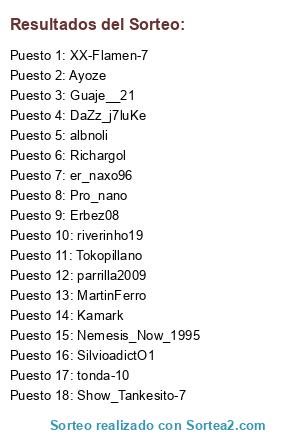 Lista de participantes: tonda-10, riverinho19, Tokopillano, Ayoze, Erbez08, albnoli, Nemesis_Now_1995, Show_Tankesito-7, DaZz_j7luKe, MartinFerro, parrilla2009, Kamark, Guaje__21, SilvioadictO1, XX-Flamen-7, Pro_nano, Richargol, er_naxo96.