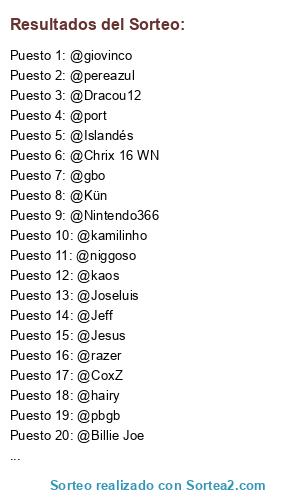 Lista de participantes: @kaos, @pbgb, @Joseluis, @Billie Joe, @Javier Capelli 2, @Jeff, @Garinaldo, @Jesus, @kamilinho, @port, @Retoriko, @Dracou12, @pereazul, @giovinco, @gbo, @niggoso, @Kün, @hairy, @Nintendo366, @eka, @kiru, @CoxZ, @razer, @InCogNito, @gurú, @Chrix 16 WN, @sbk, @Islandés.