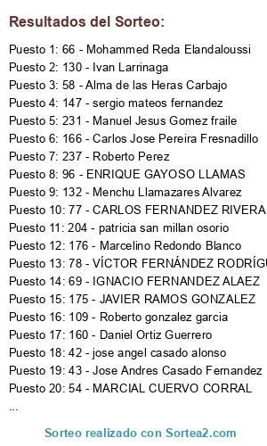 Lista de participantes: 1 - Diego Alonso Astorga, 2 - jesus alonso castañon, 3 - ESTRELLA ALONSO FIERRO, 4 - Sergio Alonso López, 5 - JOSE MARIA ALONSO MONTALVO, 6 - Isabel Alonso Velez, 7 - raul alvarez martinez, 8 - DAVID ALVAREZ ARES, 9 - CARLOS ALVAREZ CASTILLO, 10 - JOSE MARIA ALVAREZ FRANCO, 11 - RUBÉN ÁLVAREZ GONZÁLEZ, 12 - angel alvarez martinez, 13 - Félix Ámez Zapatero, 14 - Higinio Francisco Arribas Cubero, 15 - Felipe Artigue Rodriguez, 16 - Mario Baños García, 17 - Tomas Baños Granado, 18 - Iñigo Baquedano Abaunza, 51 - Jesús Cerro Piris, 20 - JULIO CESAR BARRIO GONZÁLEZ, 21 - Ivan Bernardo perez, 22 - MIGUEL BERNARDO SARIEGO, 23 - Jean Paul Bichara Garcez, 24 - Laura Blanco Pérez, 25 - Álvaro Blanco Puente, 26 - CARLOS BRAVO CONDE, 27 - Pablo Bravo Diez, 28 - Miguel Bueno Araque, 29 - MANUEL CABALLERO MOLINA, 30 - Alfredo Cadórniga Pedrosa, 31 - Roberto Calvo Barrero, 32 - JAVIER CALVO GONZALEZ, 33 - Salvador Calvo Redondo, 34 - JOSE CAMPESINO ALVAREZ, 35 - Pedro Nicolas Campesino Álvarez, 36 - Iván Campos de Cela, 37 - Joaquín Cañizares Ferrando, 38 - CARLOS A. CAÑO ALONSO, 39 - JESUS CAÑO GONZALEZ, 40 - Carlos Cao Rodríguez, 41 - LISARDO CARREÑO GARCIA, 42 - jose angel casado alonso, 43 - Jose Andres Casado Fernandez, 44 - Rafael Casamayor, 45 - FERNANDO CASQUERO FERNÁNDEZ, 46 - Belen CASTRO CASTELLANOS, 47 - Javier Castro Gonzalez, 48 - David Castro González, 67 - ENRIQUE ESQUIBEL TOMILLO, 50 - JACQUELINE CASTRO MARTINEZ, 100 - Juan Gil Ruiz, 52 - juan chamorro alonso, 53 - Javier Chico badeso, 54 - MARCIAL CUERVO CORRAL, 55 - SAÚL DE LA PEÑA GUTIÉRREZ, 56 - david de la varga lucas, 57 - JOSE ANTONIO DE LAS HERAS CANTALAPIEDRA, 58 - Alma de las Heras Carbajo, 59 - PABLO DEL RÍO FERNÁNDEZ, 60 - roberto dieguez gonzalez, 61 - neftali diez alonso, 62 - Jaime Diez Arean, 63 - Rodrigo Diez Machio, 64 - juna carlos diez reyero, 65 - Nuria Dominguez Azpeleta, 66 - Mohammed Reda Elandaloussi, 116 - SENEN GONZALEZ OTERO, 68 - david Fernandez, 69 - IGNACIO FERNANDEZ ALAEZ, 70 - Erik Fernandez Etxebarria, 71 - Alejandro Fernandez Florez, 72 - Carlos Fernandez Gutierrez, 73 - susana fernandez lopez, 74 - Manuel Fernandez Mediavilla, 75 - IVAN FERNANDEZ REBORDINOS, 76 - MARIO FERNANDEZ REGO, 77 - CARLOS FERNANDEZ RIVERA, 78 - VÍCTOR FERNÁNDEZ RODRÍGUEZ, 79 - SABINO FERNANDEZ ROMAN, 80 - Laura Fernández Torre, 81 - SERGIO FERNANDEZ-CIEZA MARCOS, 82 - Jesus Antonio Fidalgo Rodriguez, 83 - JOSÉ ANTONIO FLECHA GONZÁLEZ, 84 - avelino flecha tascon, 85 - Jeni Garcia, 86 - ALEJANDRO GARCIA ESCRIBANO, 87 - jose jorge garcia fidalgo, 88 - Jose Garcia Garcia, 89 - ENDIKA GARCIA GONZALEZ, 166 - Carlos Jose Pereira Fresnadillo, 91 - JAVIER GARCIA LOPEZ, 92 - DAVID GARCIA SUAREZ, 93 - David Garcia Suarez, 94 - Gorka Garcia Torres, 95 - JESUS GARRIDO CASADO, 96 - ENRIQUE GAYOSO LLAMAS, 97 - JONATHAN Getino villanueva, 98 - saul gil dominguez, 99 - JONATHAN GIL DOMINGUEZ, 90 - ALVARO GARCIA HERNANDEZ, 101 - jose maria gomez fernandez, 102 - JUAN MANUEL GONZALEZ ALONSO, 103 - JOAQUIN GONZALEZ ANDRES, 104 - Manuel González Arias, 105 - Guillermo gonzalez berjon, 106 - Pedro Gonzalez Castro, 107 - Francisco Manuel González Fernández, 108 - FRANCISCO JAVIER GONZÁLEZ FERNÁNDEZ, 109 - Roberto gonzalez garcia, 110 - Fernando González García, 111 - juan luis gonzalez gonzalez, 112 - Jose Manuel Gonzalez Gonzalez, 165 - INDALECIO ANTONIO PEÑACOBA MAESTRE, 114 - FRANCISCO GONZALEZ LOPEZ, 115 - Pedro Armando González López, 49 - Ricardo Castro Huelmo, 117 - juan carlos gonzalez tascon, 118 - MARCOS GRANDA GARCIA, 119 - carlos guerrero holguin, 120 - Javier Gurpegui González, 121 - LUCAS HERNÁNDEZ SESMA, 122 - silvia hernandez vega, 123 - Miguel Ángel Herrera Esteban, 124 - daniel holguera prieto, 125 - francisco manuel incio cortes, 126 - Javier Jáñez González, 127 - Alberto Jañez Moran, 128 - Saúl Jiménez del Canpo, 129 - DAVID LANCHARRO FRANCO, 130 - Ivan Larrinaga, 131 - JUAN LUIS LLAMAS ALVAREZ, 132 - Menchu Llamazares Alvarez, 133 - Juan Carlos LLamazares Ferreras, 134 - Juan José López Escudero, 135 - Fernando López Moreno, 136 - Daniel Martin Fernandez, 137 - Diego Martín Fernández, 138 - Eusebio Martin Pozas, 139 - Francisco Javier Martínez Cancelo, 140 - SERGIO MARTINEZ DE LA PUENTE, 141 - MONTSERRAT MARTÍNEZ GUERRERO, 142 - Rodrigo Martínez Montoto, 143 - DAVID MARTINEZ NICOLAS, 144 - Isabel Martinez Novo, 145 - Javier Martínez-Mingote Navarro, 146 - JOSE CARLOS MATEOS ALVAREZ, 147 - sergio mateos fernandez, 148 - RUBEN MEDIAVILLA VALLINAS, 149 - David Mendoza de la Riva, 150 - Santiago Mezquita Fernandez, 151 - ANIBAL MIGUEL FERNANDEZ, 152 - Eva Moncalián, 153 - ANGEL MONTIEL MATEOS, 154 - Francisco Antonio Morais Fernández, 155 - CARLOS MORAN ALVAREZ, 156 - Patricia Muñoz Acero, 157 - URBANO NAVARRO PALLARES, 158 - jesus antonio oblanca sanchez, 159 - ALEX OLIVERA RODRIGUEZ, 160 - Daniel Ortiz Guerrero, 161 - hector panera ferreras, 162 - FELIX PARRA RODRIGUEZ, 163 - Miguel Angel Peinador Curiel, 164 - IGNACIO PELLO ALVAREZ, 113 - Alberto Gonzalez Gonzalez, 19 - César Barreales Castro, 167 - Henar Pérez González, 168 - JUSTINIANO PÉREZ HERRERAS, 169 - VERÓNICA PÉREZ MORENO, 170 - Adrián Perez Nicolás, 171 - RUBEN PERTEJO GUTIERREZ, 172 - SALVADOR PRADAL GARCIA, 173 - juan jose prieto barrientos, 174 - VICTOR RABANAL MARTINEZ, 175 - JAVIER RAMOS GONZALEZ, 176 - Marcelino Redondo Blanco, 177 - david redondo perez, 178 - Luis Regales Fernandez, 179 - Javier Reguera Caño, 180 - ana rico enriquez, 181 - Oscar Robles Guirado, 182 - pablo rodriguez sanchez, 183 - Alfonso Rodríguez Alvarez, 184 - Jose María Rodríguez Crespo, 185 - ARMANDO RODRIGUEZ DIEZ, 186 - Cristina Rodríguez Diez, 187 - Jose Ramon Rodriguez Garcia, 188 - Miguel Rodríguez García, 189 - Edgar Rodriguez gil, 190 - OSCAR RODRIGUEZ GONZALEZ, 191 - Celestino Rodriguez Jiménez, 192 - RAMON RODRIGUEZ MEDINA, 193 - RENE RODRIGUEZ PEREZ, 194 - jose manuel rodrig