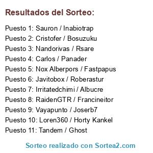 Lista de participantes: Nandorivas / Rsare, Javitobox / Roberastur, Tandem / Ghost, Carlos / Panader, Loren360 / Horty Kankel, Cristofer / Bosuzuku, RaidenGTR / Francineitor, Vayapunto / Joserb7, Irritatedchimi / Albucre, Sauron / Inabiotrap, Nox Alberpors / Fastpapus.