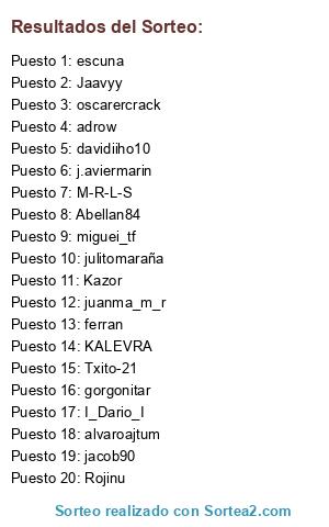 Lista de participantes: Rojinu, ferran, j.aviermarin, I_Dario_I, oscarercrack, adrow, Abellan84, escuna, gorgonitar, Txito-21, alvaroajtum, davidiiho10, juanma_m_r, Jaavyy, julitomaraña, Kazor, jacob90, M-R-L-S, miguei_tf, KALEVRA.
