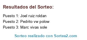 Lista de participantes: Yrene castro delgado, Ruben martinez, Pedro barbera esetrece, Ismael stoner, Esther sanchez abril, Norman deutscher, Alba fiol sanchez, Marc vivas sole, David ribera, Toño aibar remacha, Sara subias estage, Quim nolla debes, Marxe duran gil, Geerard lidon, Sonia quiñones, David celada torrecillas, Pedrito vw polow, Kris alarcon, Michelle krabbenhoft, Joel ruiz roldan, Nerea gaona Santiago, Ruben tetuá sanchez rey, Carlos rodriguez sanchez, Luis león gpr, Alex Maza, Carlos diaz lara, Victor marzos lazaro, Laura Ma, Neus segarra, Ricard riambau, Sandra montañez mateu, Adrianna Silva, Ivan GA, David Ros, Adrii Rubio, Antonio Diaz Iñiguez, Alba Zamora lozano, Noelia Corvo, Wash garaje, Andrea Serrano Gutierrez, Ariadna Balaguero Iglesias, Juan Manuel Mula.