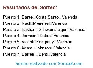 Lista de participantes: PT REINA 90, MP SILVA 85, SP VILLA 87, PT VALDES 87, CT DEALBERT 80, CT ALEXIS 78, LAT FILIPE LUIS 74, MCD MADURO 73, INT JOAQUIN 81, SP MATA 80, DC GÜIZA 79, CT MARCHENA 76, CT CHIGRYNSKI 77, LAT MIGUEL 81, CT MATERAZZI 81, INT VICENTE 84, MCD KOMPANY 82, INT CAZORLA 83.