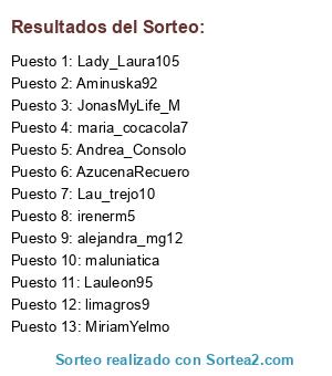 Lista de participantes: 3kariconk3, alejandra_mg12, Aminuska92, Andrea_Consolo, arana92, AzucenaRecuero, Danijimcab, Diiiiiiidi, EmmaSelvas, irenerm5, IrenitaFdez, JonasMyLife_M, Lady_Laura105, Lau_trejo10, Lauleon95, limagros9, maluniatica, maria_cocacola7, Marta Duce Navarro, MiriamYelmo, NatiQuiros, RedParthner, RubenNN1.