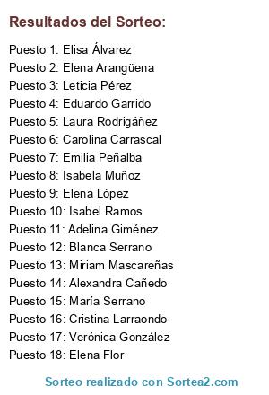 Lista de participantes: María Serrano, Adelina Giménez, Elisa Álvarez, Eduardo Garrido, Blanca Serrano, Verónica González, Cristina Larraondo, Elena López, Emilia Peñalba, Isabel Ramos, Alexandra Cañedo, Carolina Carrascal, Miriam Mascareñas, Elena Flor, Leticia Pérez, Isabela Muñoz, Elena Arangüena, Laura Rodrigáñez.