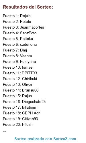 Lista de participantes: Citizen93, Rayulin, Pottoka, Juanjx, Oliver, Guindis, Fustynho, Dmj, Rajus, Agoney, Fflush, cadenona, billabonn, Mariuco, Javitun, Vaanta, Chiribuki, CEPH Adri, Bransu66, Juanmacortes, Potete, SanzFoto, Mulatronic, Rojals, DPiTT93, MenaST85, Egdarjrc3, Adrii16, Diegochato23, Ismael.