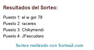 Lista de participantes: xXTorkTFXx, raceres, Chikymendi, educrak94, USA MIKE ESP, Vegakun84, CaseOn3, ROETASSSSS, MAKOR360, RavenDruid, Maitrot, Juez Holden BMF, HeroAstra, Arisajai, Kuwux, JFescudero, dpresa, LucDucati, Blodwid79, Hortysantiago, el w gor 78, danii0692, AfrroPerez, maconil.