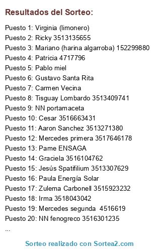 Lista de participantes: Carmen Vecina , Paula Energía Solar , Gabriel Ortiz 2512539102 , NN fenogreco 3516301235 , Zulema Carbonell 3515923232 , Virginia (limonero) , Guada , Pablo miel , Silvio 3516008040 , Claudia jardín , Gustavo Santa Rita , Mariana 4517356 , Pame ENSAGA , Mercedes primera 3517646178 , Mariano (harina algarroba) 152299880 , Irma 3518043042 , Gabi y Tati 156324330 , Patricia 4717796 , Vanesa Palo de Agua 156585727 , Jesús Spatifilium 3513307629 , Walter Barraza 4715288 , Lucía (Arrope) 1554048444 , Elio (Jazmín) 3512398450 , Mercedes segunda 4516619 , Tisguay Lombardo 3513409741 , Cesar 3516663431 , Graciela 3516104762 , Gabriela Contreras 3516686225 , Javier 3516799242 , Aaron Sanchez 3513271380 , Anabela 3517529503 , Lucas 3515318831 , Sulema Carbonell 3515923232 , Nelly (macetas) 3516717134 , Ricky 3513135655 , Euge 3515321222 , Jesús 3515328539 , Horacio 294154566111 , Viviana (amiga Inés 1) , Viviana (amiga Inés 2) , María Suarez 3515739905 Oncativo 1010 2°D , NN portamaceta.