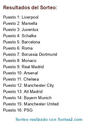 Lista de participantes: Barcelona, Real Madrid, Atl Madrid, Manchester City, Manchester United, Chelsea, Arsenal, Liverpool, Bayern Munich, Borussia Dortmund, Schalke, PSG, Monaco, Marsella, Juventus, Roma.