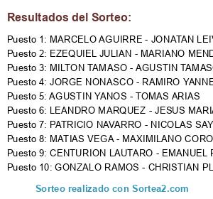 Lista de participantes: JORGE NONASCO - RAMIRO YANNETTI, CENTURION LAUTARO - EMANUEL RODRIGO, MARCELO AGUIRRE - JONATAN LEIVA, PATRICIO NAVARRO - NICOLAS SAYAL, EZEQUIEL JULIAN - MARIANO MENDOZA, LEANDRO MARQUEZ - JESUS MARIA FERNANDEZ, GONZALO RAMOS - CHRISTIAN PLENAZZIO, AGUSTIN YANOS - TOMAS ARIAS, MILTON TAMASO - AGUSTIN TAMASO, MATIAS VEGA - MAXIMILANO CORONEL.