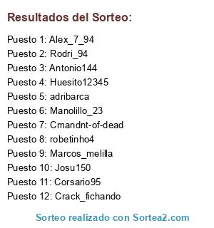 Lista de participantes: Crack_fichando, Josu150, Rodri_94, Huesito12345, Corsario95, Cmandnt-of-dead, Manolillo_23, Antonio144, Alex_7_94, Marcos_melilla, robetinho4, adribarca.