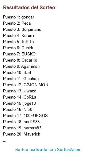 Lista de participantes: bart1983, victorochoa, Maverick, 100FUEGOS, burfok, ToRiTo, Gicahagi, Kurunir, CoRLa, Peca, Nitr0, Oscarillo, Borjamaris, EUSKO, juanlutotty, Dubidu, kiwazo, herrera83, Agamelon, gongar, joge10, Hugor83, Bart, G2JONIMON.