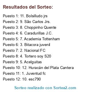 Lista de participantes: 1. Juventud fc, 2. Nacional FC, 3. Bitacora juvenil, 4. Tortero soy S20, 5. Acelguitas, 6. Caradurillas J.C., 7. Academia Tottenham, 8. Choppinho Quente, 9. São Carlos Jrs., 10. esc790, 11. Bolsilludo jrs, 12. Huracán del Plata Cantera.