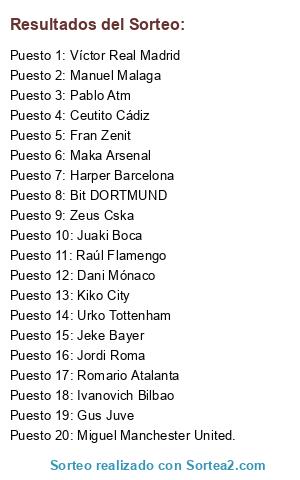 Lista de participantes: Kiko City, Harper Barcelona, Dani Mónaco, Manuel Malaga, Pablo Atm, Gus Juve, Raúl Flamengo, Ceutito Cádiz, Maka Arsenal, Víctor Real Madrid, Zeus Cska, Jeke Bayer, Bit DORTMUND, Fran Zenit, Ivanovich Bilbao, Jordi Roma, Juaki Boca, Romario Atalanta, Urko Tottenham, Miguel Manchester United..