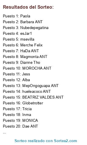 Lista de participantes: Laura FLFC ANT(2 participaciones), RaquelDonaLis ANT(2 participaciones), Nuku-Nuku ANT(2 participaciones), Brujamr ANT(2 participaciones), Alejandra ANT(2 participaciones), Lunika512 ANT(2 participaciones), Dae ANT(2 participaciones), Magmonta ANT(2 participaciones), Bethya, Saray Sierra, Trihia ANT(2 participaciones), Alba, Adrierika MakeUP, Piruleta ANT(2 participaciones), Haizeatxu, Becky Torres, ObeBlog ANT(2 participaciones), Zoe, Ilusibnchenoll, MybeautyCorner ANT(2 participaciones), Sissuka, Isa, Elgatodelpuntodecruz, Mai, Sandraxula_153, Jess, Nestheroski ANT(2 participaciones), Xinty, Creacionesjamc, TERMIXRO ANT(2 participaciones), ADRIANARTE1, AnitaMétier, Pitty, MONICA, MENSIN32, yo-2006, Tricia, Nana313, MepOngoguapa ANT(2 participaciones), Eclipse, Marikilla Detallitos ANT(2 participaciones), Maria ANT(2 participaciones), HaDa ANT(2 participaciones), Ana_lapazzesca, G.O. ANT(2 participaciones), Aralla007, Jonolun, Isamar, Yeneva, Marta Rey ANT(2 participaciones), MariJo, RoSi, Silvia, AXIA, Inma, Barbara ANT(2 participaciones), Las Cosicas de Ange ANT(2 participaciones), Msevilla, MASganchiYO, Chispitas, Noelia Soriano, esJar1, Nona Artesania, Natillas, tami, Carmen, Mi cesta de maquillaje, Nenanina, Nurya G, Anastasiaalanga, Patricia es.se, MissMargot, MOROCHA ANT(2 participaciones), BEATRIZ VALDES ANT(2 participaciones), TussecretosdebellezSaI, Heaven, Nubedepegatina, Lidia, Mª José, Missira, Nenaleti, Neda, Globetrotter, Olga, Eva Murillo, El Hada de las palabras, MeryyD, Nelida Castillo K, Izaskun, EvaGema, Lola Mine, Paola, Asun, Merche Felix, Estefania Carcas, NANDIOCK, Laura _m85, Jessi, Yosolitamemaquillo, Miavi ANT, Miavi, PURI, -=-Eilynd-=-, Quel, Flora hanna, hueleacoco ANT(2 participaciones), Tras el Secreto de venus ANT(2 participaciones), rocio cuerda, Garda Artesania, msevilla, titicreaciones, Raquel, Dianne Tho, Elenita, Celiaa23.