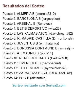 Lista de participantes: BARCELONA B (jorgeoptico), ALMERIA B (osorolo2310), BETIS DEPORTIVO (wisa23), LAS PALMAS ATCO. (davidbrocha82), R. MADRID CASTILLA (DrFronkonstin), AT. MADRID B (puga14), ARSENAL B (Renovac), ZARAGOZA B ((xX_BaLa_XoN_Xx), LIVERPOOL B (pacopaquet), TOTTENHAM B (AyozePodolski), PSG B (alfitantalo), REAL SOCIEDAD B (Pedro2408), JUVENTUS B (el_Thatanka), BORUSSIA DORTMUND B (ismaeljimva).