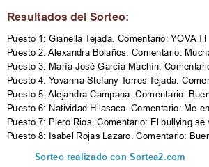 - Ganador 6: Natividad Hilasaca. Comentario: Me encantó el video. El tema que abordan es muy delicado, por ende, es de suma importancia transmitir y brindar las herramientas necesarias para combatirlo Sigan así, lo hicieron genial. 🤩