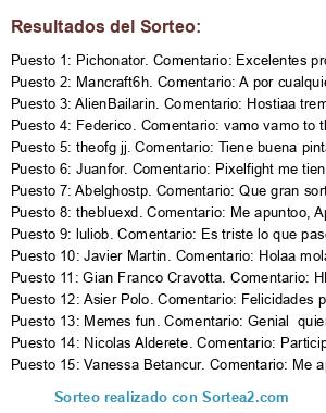 - Ganador 1: Frifaynoche. Comentario: Estaba viendo tu video de Guía Pixelfights y vi que tenias un sorteo activo