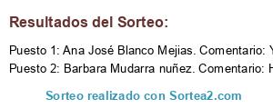 - Ganador 2: Barbara Mudarra nuñez. Comentario: Hola, me encantaría tener esa papeleta para el sorteo del sábado de la feria!!!😉